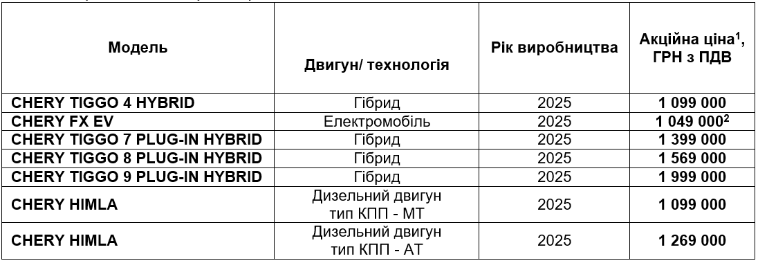 ТОВ "СІ ЕЙ АВТОМОТІВ", офіційний дистриб'ютор автомобілів CHERY в Україні, оголошує про безпрецедентне розширення модельного ряду з акційними цінами на нові моделі. Наприкінці жовтня – першій половині листопада 2025 року в дилерській мережі CHERY в Україні очікується надходження одразу шести нових моделей: гібридних кросоверів CHERY TIGGO 4 HYBRID, CHERY TIGGO 7 PLUG-IN HYBRID, CHERY TIGGO 8 PLUG-IN HYBRID, флагмана CHERY TIGGO 9 PLUG-IN HYBRID, повністю електричного CHERY FX EV та потужного рамного пікапа CHERY HIMLA.